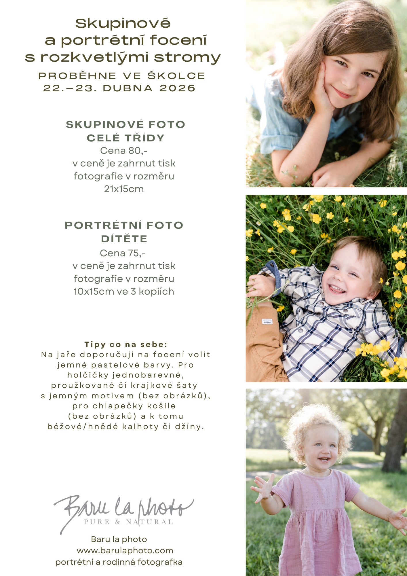 Jarní focení celých tříd a nabídka individuální fotografie dítěte - možnost focení je v nabídce přiloženého letáčku. Při focení ve školce není možné vyhovět požadavkům focení sourozenců ani kamarádů. U předškoláků bude jedna fotografie použita na tablo.
